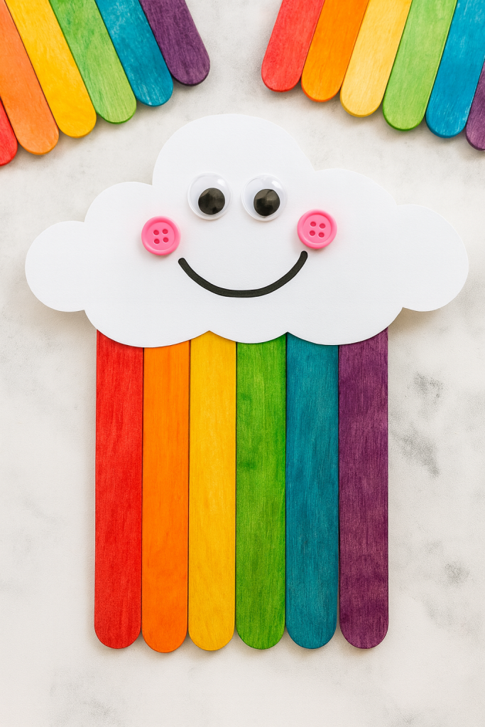 - Pega por detrás los palos de helado en forma de arcoíris (en fila).