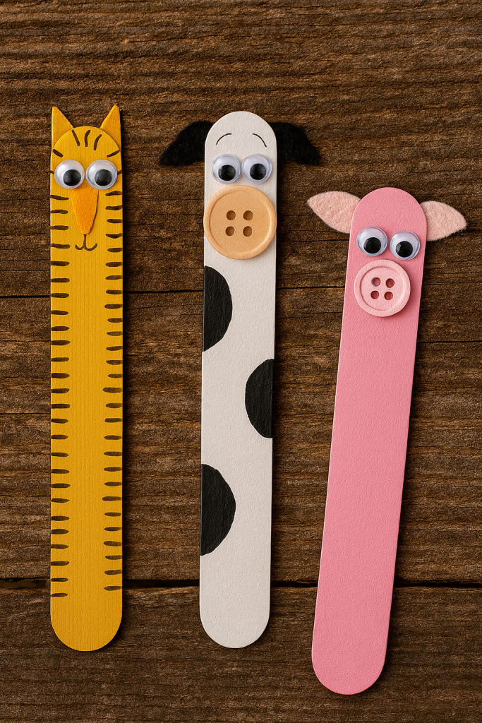 Materiales: palos de helado, pintura del color a elegir, cartulina o goma EVA para orejas/hocico, ojos móviles, rotuladores, pegamento.