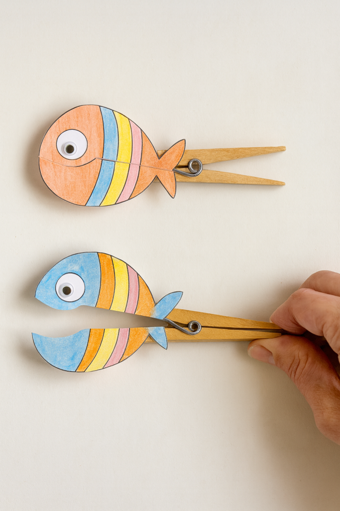 - Pega el pez a la pinza (un lado a cada parte de la pinza, respetando la boca).