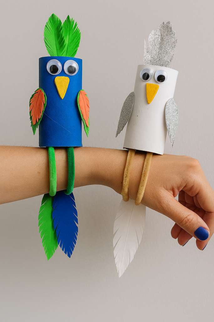 Materiales: rollo de papel (cartón), cartulina de colores, ojos móviles, plumas (o cartulina recortada), limpiapipas, pegamento.