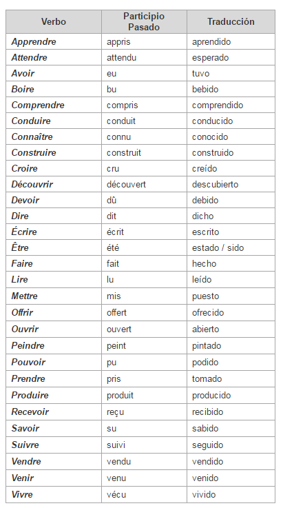 Listado de verbos en participio pasado en francés y su traducción a español