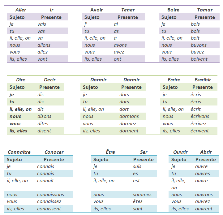 A continuación puedes ver un ejemplo de conjugaciones en presente para los verbos irregulares más comunes en francés: